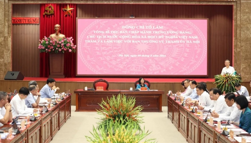 Phát biểu chỉ đạo tại buổi làm việc, Tổng Bí thư, Chủ tịch nước Tô Lâm thay mặt lãnh đạo Đảng và Nhà nước biểu dương, đánh giá cao sự cố gắng, nỗ lực phấn đấu và những kết quả, thành tựu mà Đảng bộ, chính quyền và nhân dân Thủ đô đã đạt được trong thời gian qua. Nhất là trong những năm gần đây, Hà Nội trở thành địa phương tiêu biểu, đi đầu cả nước trên nhiều lĩnh vực, trở thành một điểm sáng về đổi mới, một cực tăng trưởng của vùng Đồng bằng sông Hồng, khu vực phía Bắc và của cả nước.