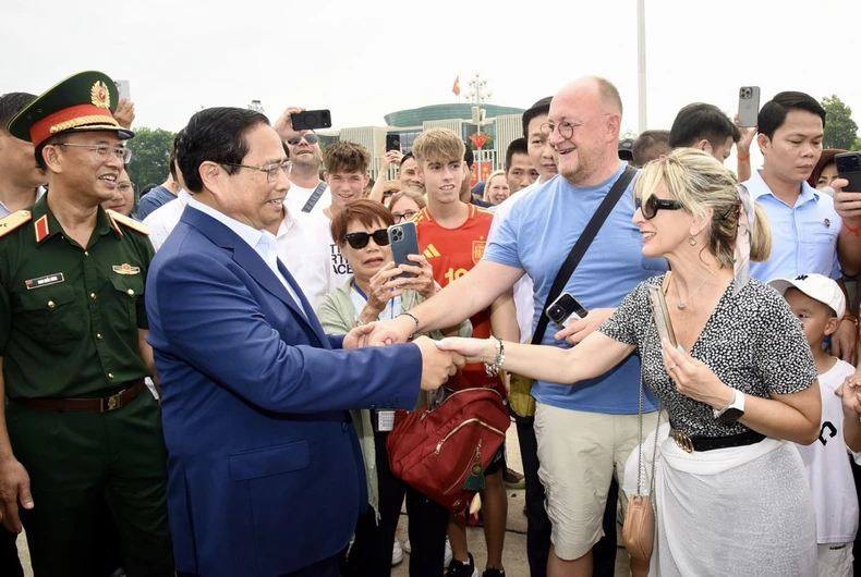Thủ tướng Phạm Minh Chính với khách quốc tế tại Quảng trường Ba Đình. (Ảnh; Trần Hải).