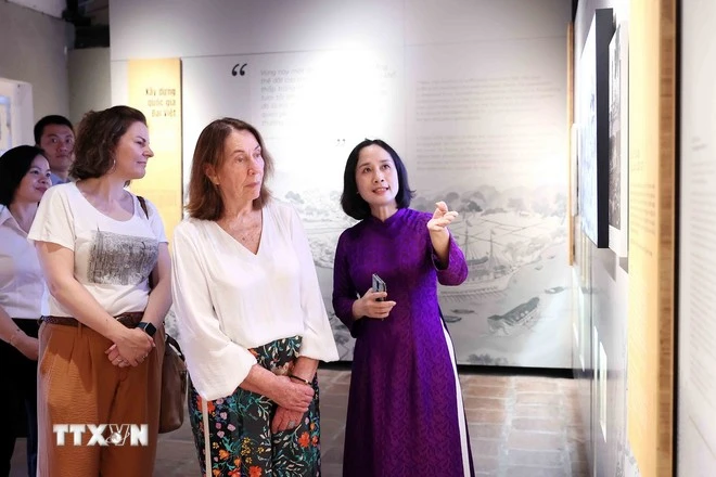 Chủ tịch Thượng viện Australia Sue Lines tham quan Khu Di tích Văn Miếu-Quốc Tử Giám. (Ảnh: TTXVN).