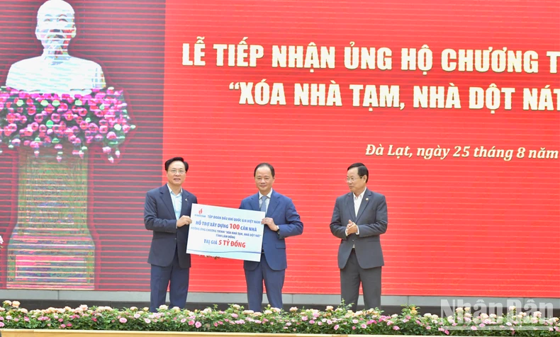 Đại diện lãnh đạo Tập đoàn Dầu khí Quốc gia Việt Nam ủng hộ 5 tỷ đồng cho Chương trình "Xóa nhà tạm, nhà dột nát" tỉnh Lâm Đồng. (Ảnh: Thanh Giang).