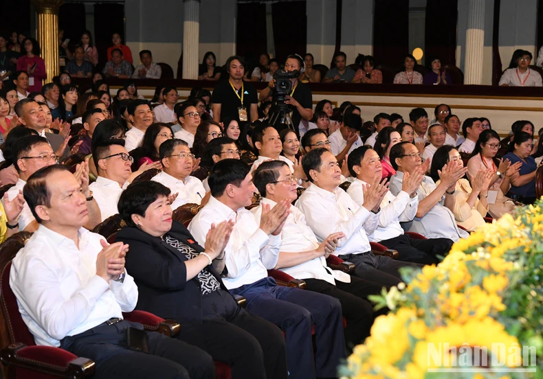 Chủ tịch Quốc hội Trần Thanh Mẫn cùng các đồng chí lãnh đạo Đảng, Nhà nước và các đại biểu dự chương trình. (Ảnh: Duy Linh).