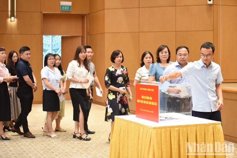 Cán bộ, công chức, viên chức, người lao động Văn phòng Chính phủ quyên góp ủng hộ đồng bào khắc phục hậu quả bão số 3. (Ảnh: Trần Hải).