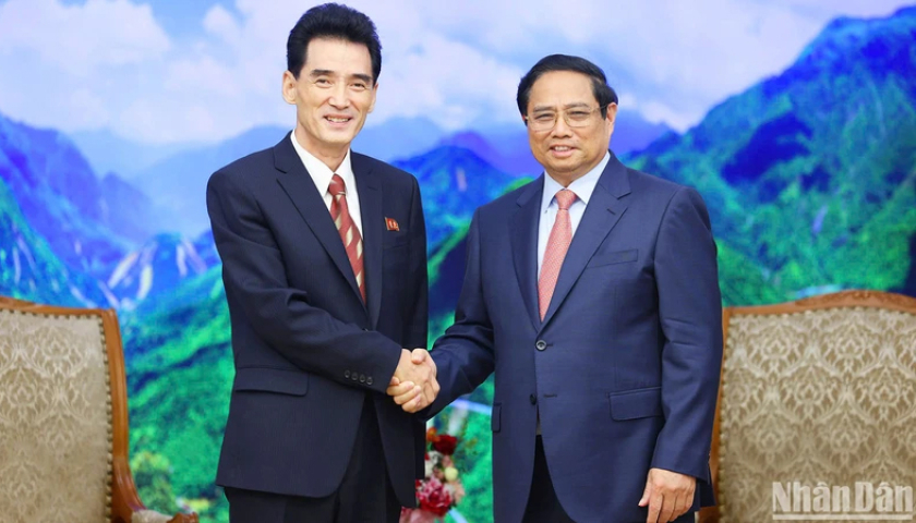 Thủ tướng Phạm Minh Chính và Đại sứ Cộng hòa Dân chủ nhân dân Triều Tiên tại Việt Nam Ri Sung Guk. (Ảnh: TRẦN HẢI).