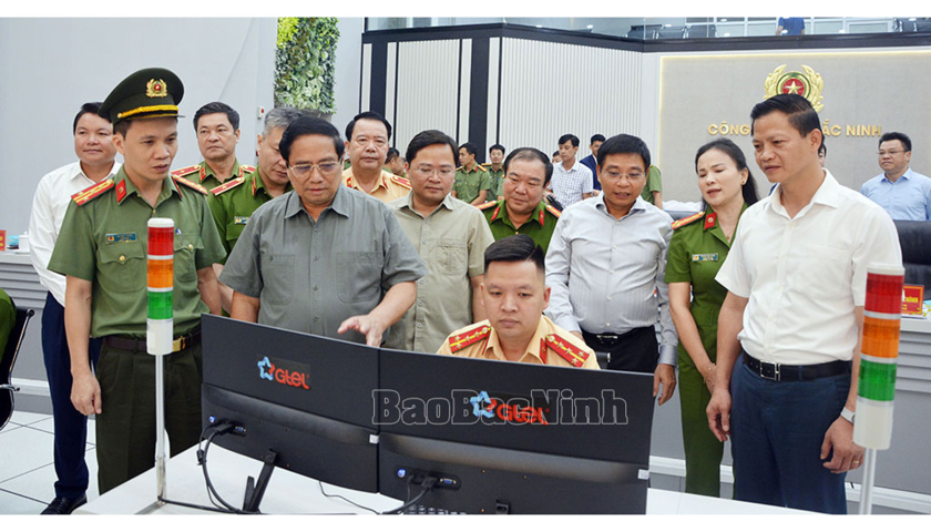 Thủ tướng Chính phủ Phạm Minh Chính cùng các đồng chí lãnh đạo và các đại biểu thăm Trung tâm Thông tin chỉ huy Công an tỉnh.
