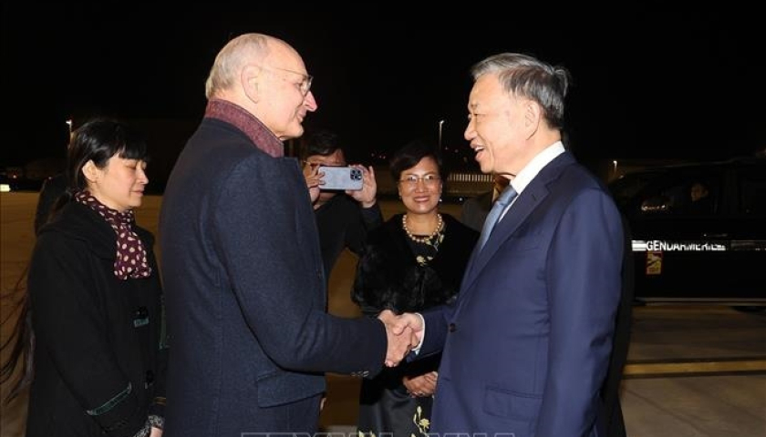 Đại diện Cục Lễ tân, Bộ Ngoại giao Pháp mời Tổng Bí thư, Chủ tịch nước Tô Lâm đi trên thảm đỏ dọc theo hai hàng tiêu binh, bắt tay các quan chức ra đón. Đông đảo cộng đồng người Việt Nam tại Pháp vẫy cờ, hoa chào mừng Tổng Bí thư, Chủ tịch nước Tô Lâm và Đoàn đại biểu cấp cao Việt Nam.