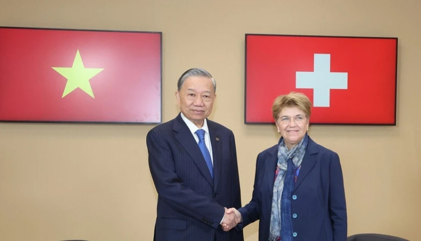 Tại cuộc gặp với Tổng thống, Bộ trưởng Quốc phòng, Bảo vệ dân sự và Thể thao Thụy Sĩ Viola Amherd, Tổng Bí thư, Chủ tịch nước chúc mừng những thành tựu phát triển vượt bậc của Thụy Sĩ thời gian qua; cảm ơn những tình cảm chân thành mà Nhà nước và nhân dân Thụy Sĩ cũng như cá nhân Tổng thống dành cho Việt Nam; cảm ơn Thụy Sĩ đã hỗ trợ Việt Nam 1 triệu franc và kịp thời gửi nhiều trang thiết bị, chuyên gia để giúp Việt Nam khắc phục hậu quả của cơn bão Yagi.