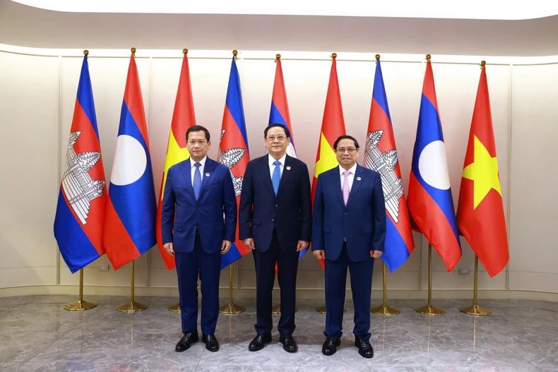 Thủ tướng Phạm Minh Chính, Thủ tướng Lào Sonexay Siphandone và Thủ tướng Campuchia Hun Manet. (Ảnh: NHẬT BẮC-VGP).