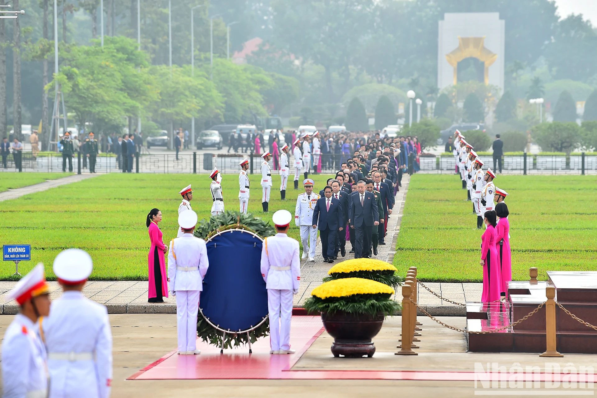 Tổng Bí thư, Chủ tịch nước Tô Lâm, Thủ tướng Phạm Minh Chính, Chủ tịch Quốc hội Trần Thanh Mẫn, Thường trực Ban Bí thư Lương Cường dẫn đầu Đoàn đại biểu vào Lăng viếng Chủ tịch Hồ Chí Minh.