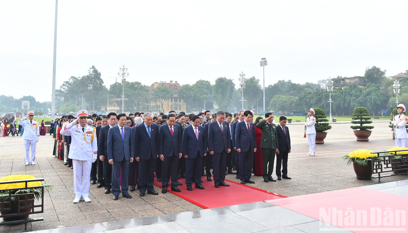 Tổng Bí thư, Chủ tịch nước Tô Lâm; Thủ tướng Phạm Minh Chính; Chủ tịch Quốc hội Trần Thanh Mẫn; Thường trực Ban Bí thư Lương Cường cùng các đồng chí lãnh đạo Đảng, Nhà nước, đại biểu Quốc hội thành kính tưởng nhớ Chủ tịch Hồ Chí Minh.