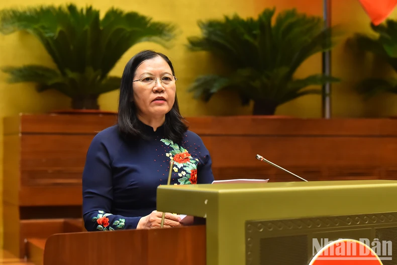 Chủ nhiệm Ủy ban Tư pháp của Quốc hội Lê Thị Nga trình bày Báo cáo giải trình tiếp thu, chỉnh lý dự thảo Luật Phòng, chống mua bán người (sửa đổi). (Ảnh: THỦY NGUYÊN).