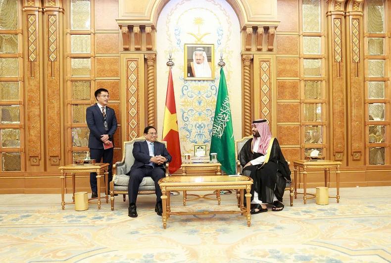 Thủ tướng Chính phủ Phạm Minh Chính hội đàm với Hoàng Thái tử, Thủ tướng Saudi Arabia Mohammed bin Salman Bin Abdulaziz Al Saud (Ảnh: Dương Giang/TTXVN).
