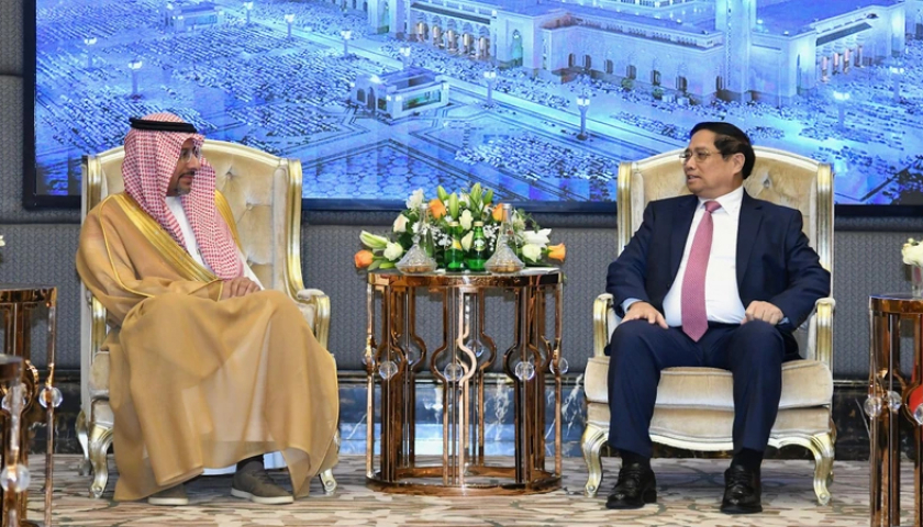 Thủ tướng Chính phủ Phạm Minh Chính và Bộ trưởng Công nghiệp và Khoáng sản Saudi Arabia Bandar Alkhorayef (Ảnh: THANH GIANG).