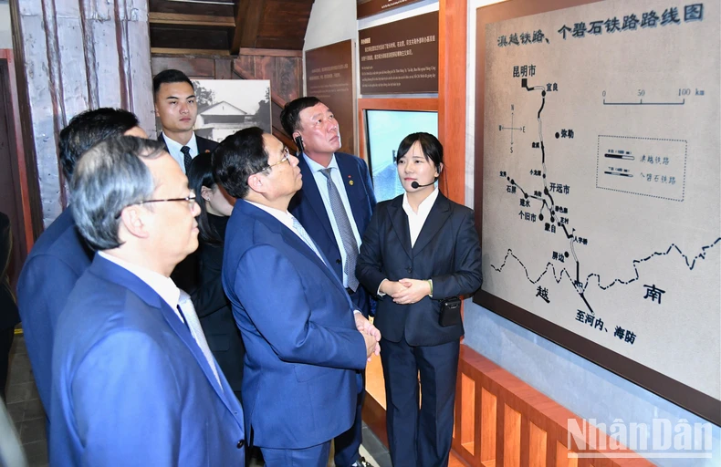 Thủ tướng Phạm Minh Chính nghe thuyết minh về sự nghiệp hoạt động cách mạng của Chủ tịch Hồ Chí Minh tại Côn Minh. (Ảnh: Thanh Giang).
