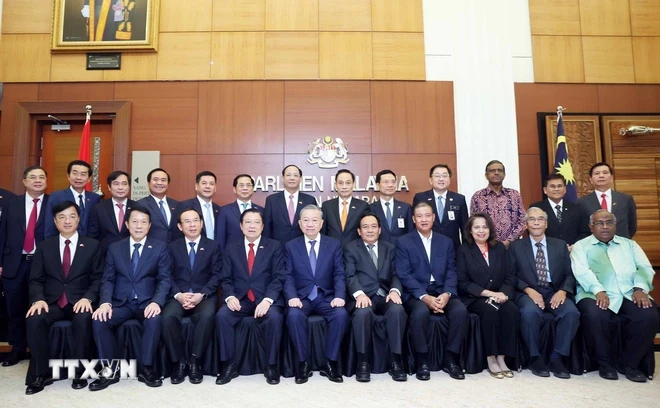 Tổng Bí thư Tô Lâm, Chủ tịch Thượng viện Malaysia Awang Bemee Awang Ali Basah và các đại biểu chụp ảnh chung. (Ảnh: Thống Nhất/TTXVN).