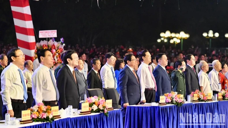 Thủ tướng Phạm Minh Chính và các đồng chí lãnh đạo Đảng, Nhà nước, các đại biểu thực hiện nghi thức chào cờ tại Lễ kỷ niệm. (Ảnh: THANH GIANG).