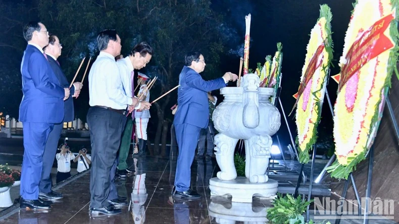 Thủ tướng Phạm Minh Chính và các đồng chí lãnh đạo Đảng, Nhà nước dâng hương tưởng niệm các Anh hùng liệt sĩ tại Đài tưởng niệm Chiến thắng Bình Giã. (Ảnh: THANH GIANG).