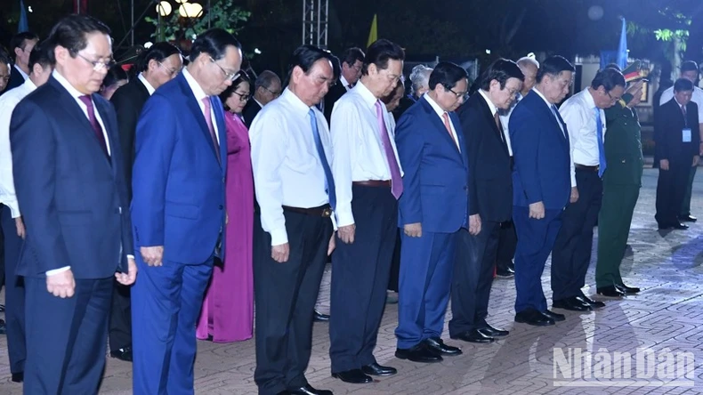 Thủ tướng Phạm Minh Chính và các đồng chí lãnh đạo Đảng, Nhà nước dành một phút mặc niệm tưởng nhớ các Anh hùng liệt sĩ. (Ảnh: THANH GIANG).