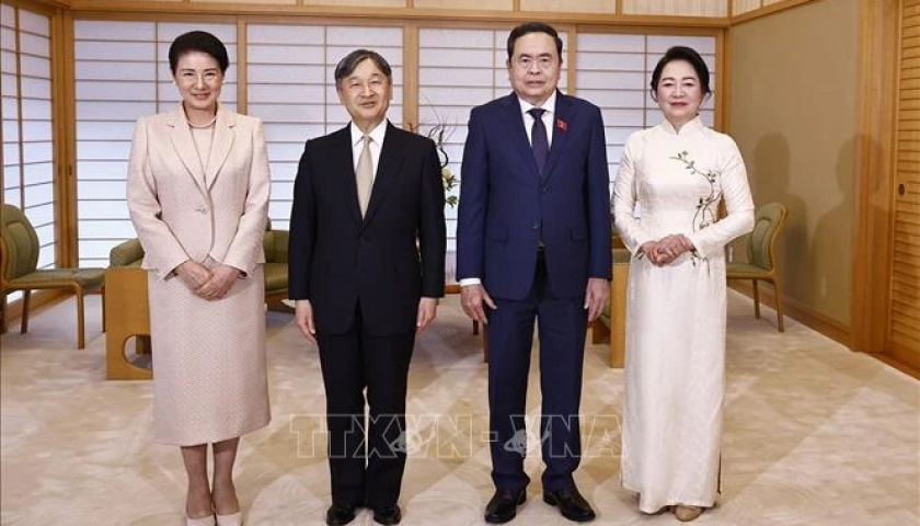 Chủ tịch Quốc hội Trần Thanh Mẫn và Phu nhân hội kiến Nhà vua Naruhito cùng Hoàng hậu Masako. Ảnh: Doãn Tấn/TTXVN.