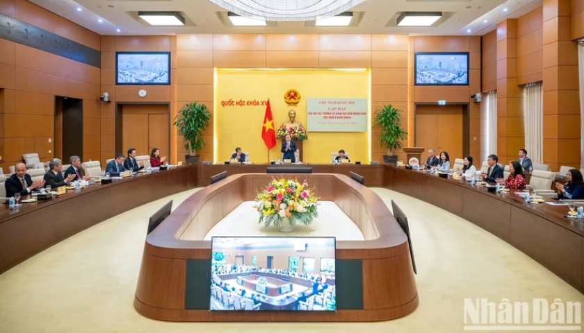Chủ tịch Quốc hội Trần Thanh Mẫn với các Đại sứ, Trưởng cơ quan đại diện tại cuộc gặp. (Ảnh: DUY LINH).