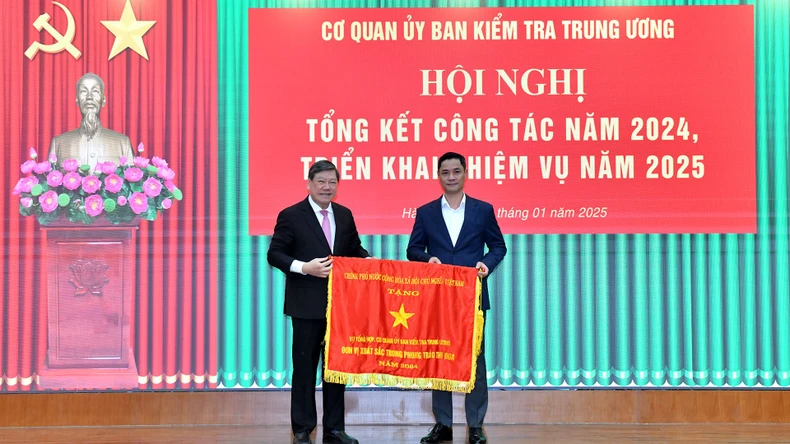 Đồng chí Trần Cẩm Tú, Ủy viên Bộ Chính trị, Thường trực Ban Bí thư, Chủ nhiệm Ủy ban Kiểm tra Trung ương trao Bằng khen của Thủ tướng Chính phủ tặng Cơ quan Ủy ban Kiểm tra Trung ương. (Ảnh: ĐĂNG KHOA).