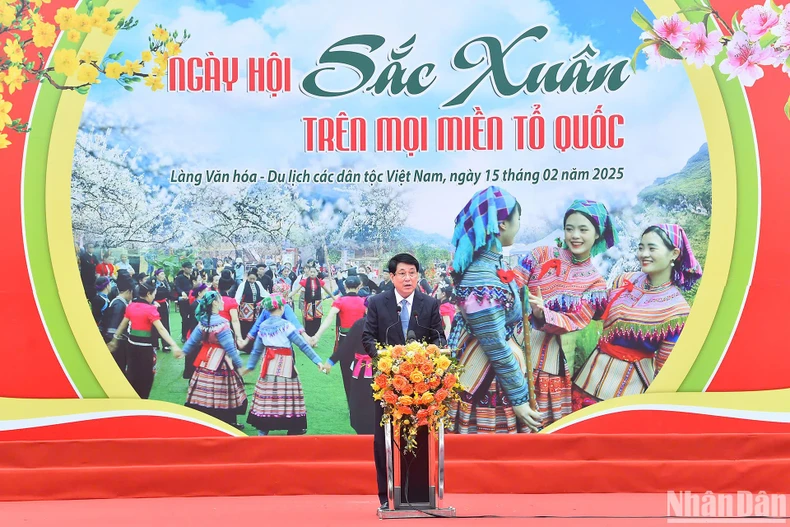 Phát biểu tại ngày hội và chúc Tết cộng đồng các dân tộc Việt Nam, Chủ tịch nước bày tỏ vui mừng về dự ngày hội “Sắc xuân trên mọi miền Tổ quốc" Xuân Ất Tỵ năm 2025 - một sự kiện thường niên được Bộ Văn hóa, Thể thao và Du lịch tổ chức tại Làng Văn hóa - Du lịch các dân tộc Việt Nam, nơi góp phần hội tụ, gắn kết các dân tộc, bảo tồn, phát huy, lan tỏa các giá trị văn hóa truyền thống, đặc sắc của các dân tộc anh em trong đại gia đình các dân tộc Việt Nam.