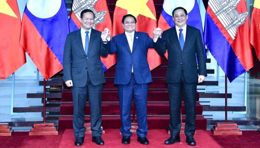 Thủ tướng Phạm Minh Chính với Thủ tướng Lào Sonexay Siphandone và Thủ tướng Campuchia Hun Manet (Ảnh: THANH GIANG).