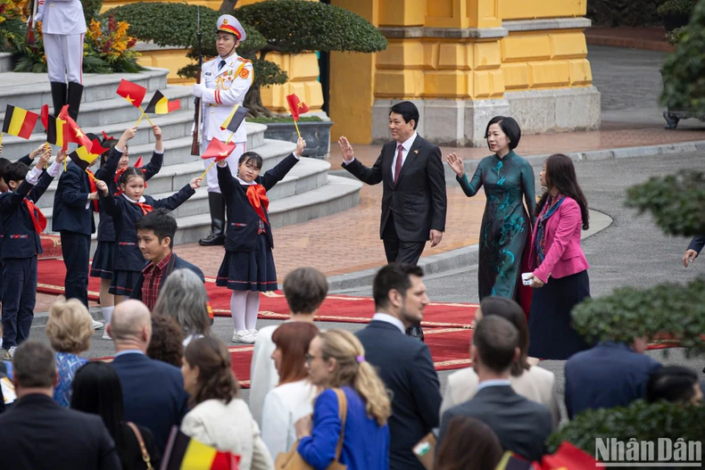 Đoàn xe hộ tống đưa Nhà vua Philippe và Hoàng hậu tiến vào Phủ Chủ tịch, Chủ tịch nước Lương Cường và phu nhân có mặt tại thảm đỏ nồng nhiệt chào đón Nhà vua Philippe dẫn đầu Đoàn cấp cao Bỉ thăm cấp Nhà nước tới Việt Nam. Đại diện các cháu thiếu nhi Thủ đô tiến tới trao tặng bó hoa tươi thắm tới Nhà vua và Hoàng hậu.