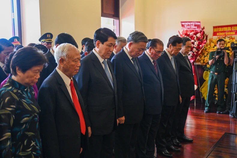 Các đồng chí lãnh đạo, nguyên lãnh đạo Đảng, Nhà nước dâng hương tưởng niệm Chủ tịch Hồ Chí Minh tại Bảo tàng Hồ Chí Minh - Chi nhánh Thành phố Hồ Chí Minh (Bến Nhà Rồng). (Ảnh: Duy Linh).