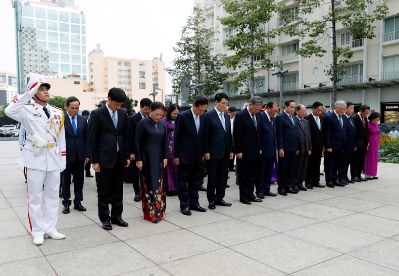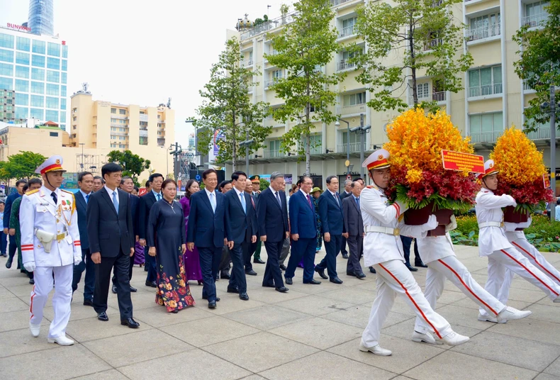 Các đồng chí lãnh đạo, nguyên lãnh đạo Đảng, Nhà nước thành kính tưởng niệm Chủ tịch Hồ Chí Minh tại Công viên Tượng đài Bác Hồ (Quận 1, thành phố Hồ Chí Minh). (Ảnh: Duy Linh).