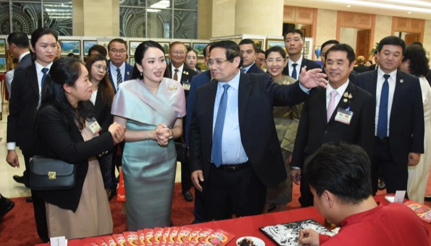 Thủ tướng Phạm Minh Chính cùng Thủ tướng Thái Lan tham quan triển lãm sản phẩm thủ công mỹ nghệ