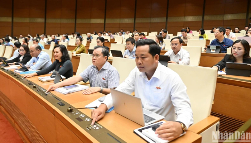 Đại biểu Quốc hội bấm nút thông qua Nghị quyết của Quốc hội về điều chỉnh, bổ sung dự toán ngân sách Nhà nước năm 2025. (Ảnh: THỦY NGUYÊN).