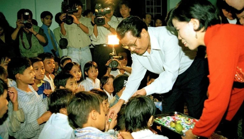 Chủ tịch nước Trần Đức Lương vui tết Trung thu và tặng quà cho các cháu có hoàn cảnh khó khăn, mồ côi được nuôi dậy tại các cơ sở mái ấm tình thương ở các quận, huyện của thành phố Hà Nội ngày 5/10/1998. (Ảnh: Trọng Nghiệp/TTXVN).
