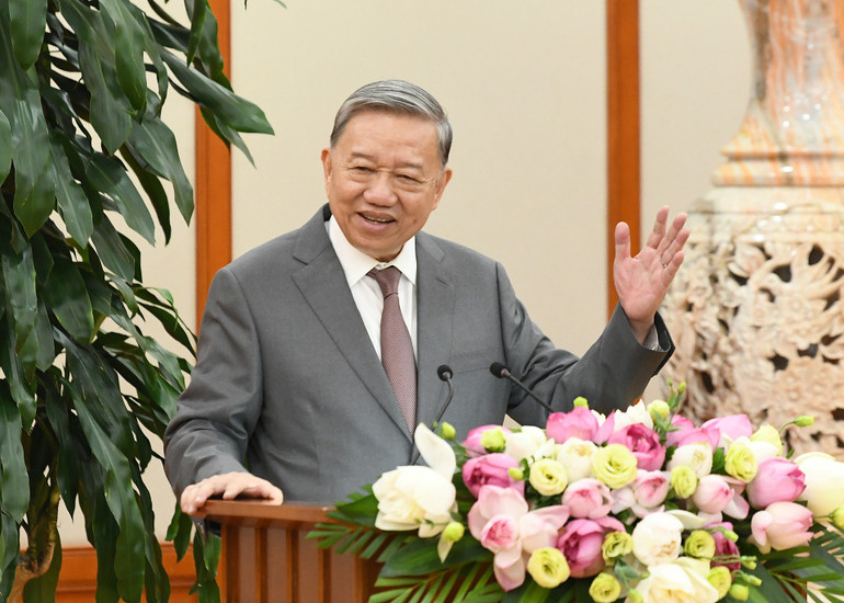 Tổng Bí thư Tô Lâm phát biểu tại buổi gặp mặt. (Ảnh: THỦY NGUYÊN).