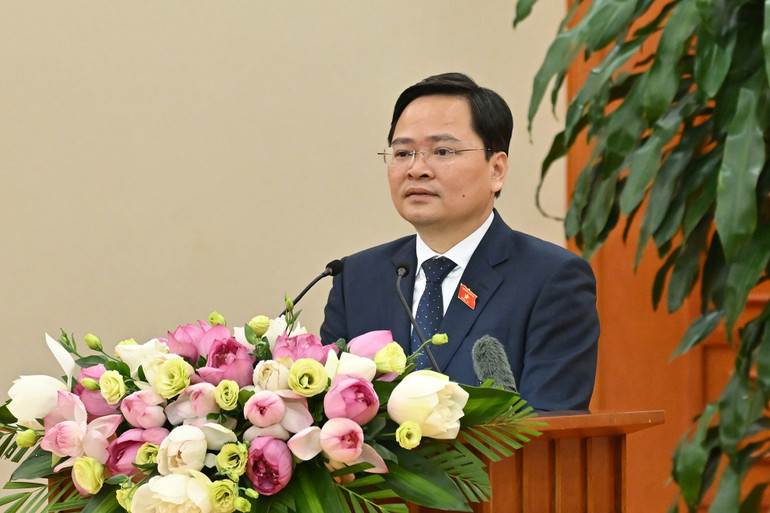 Đại biểu Quốc hội Nguyễn Anh Tuấn, Ủy viên Trung ương Đảng, Bí thư Tỉnh ủy Bắc Ninh, Chủ tịch Nhóm Đại biểu Quốc hội trẻ Khóa XV báo cáo tại buổi gặp mặt. (Ảnh: THỦY NGUYÊN).