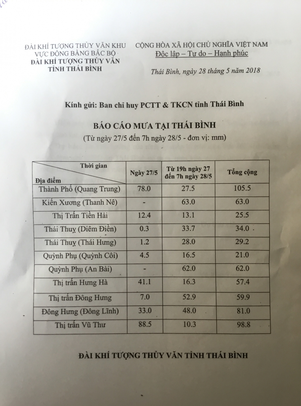 Ngày 28/5, Đài Khí tượng Thủy văn tỉnh Thái Bình có báo cáo mưa tại Thái Bình (Từ ngày 27/5 đến 7h ngày 28/5).