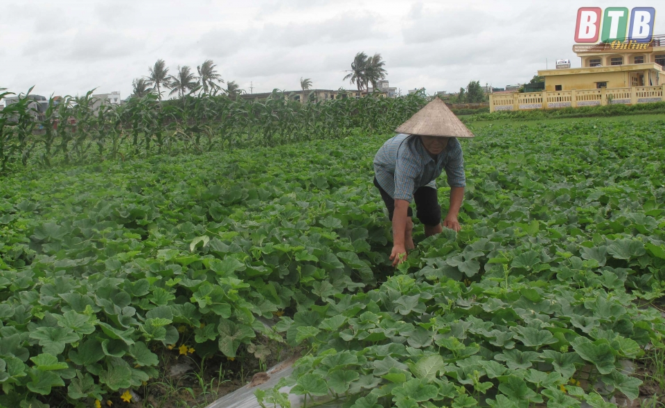 Nông dân huyện Kiến Xương chăm sóc dưa lê hè.