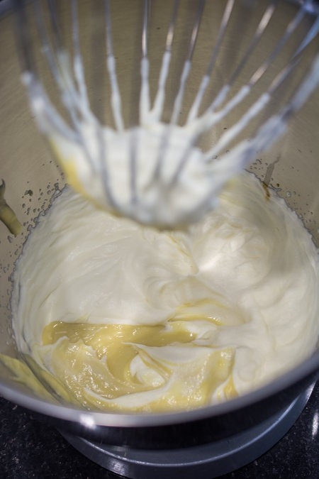 Kem tươi đánh bông tới khi tạo chóp thì dừng lại. Sau đó cho phần sầu riêng sữa và vani vào trộn đều lên.
