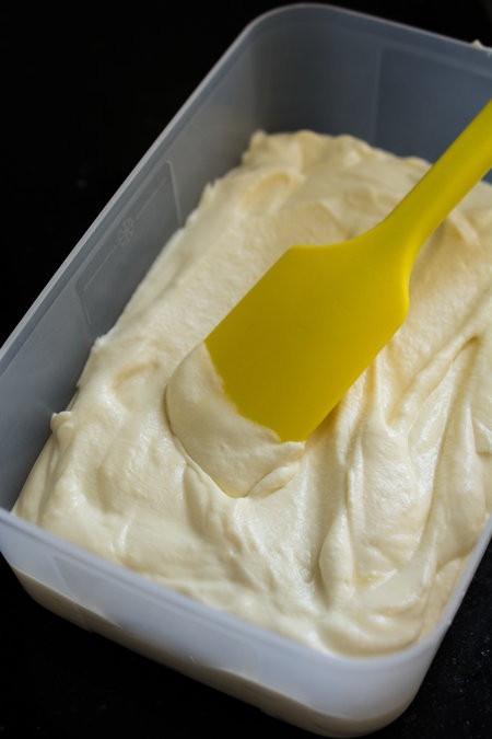 Cho kem vào hộp, đây lại đem bỏ vào ngăn đông 1 đêm là có thể dùng được.