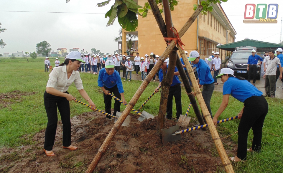 Trồng cây xanh trong khuôn viên Trường THCS Văn Lang (Hưng Hà).