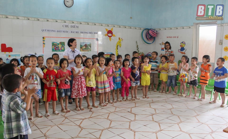 Cô và trò Trường Mầm non Tây Giang (Tiền Hải) thi đua dạy tốt, học tốt.