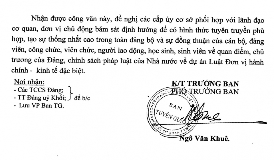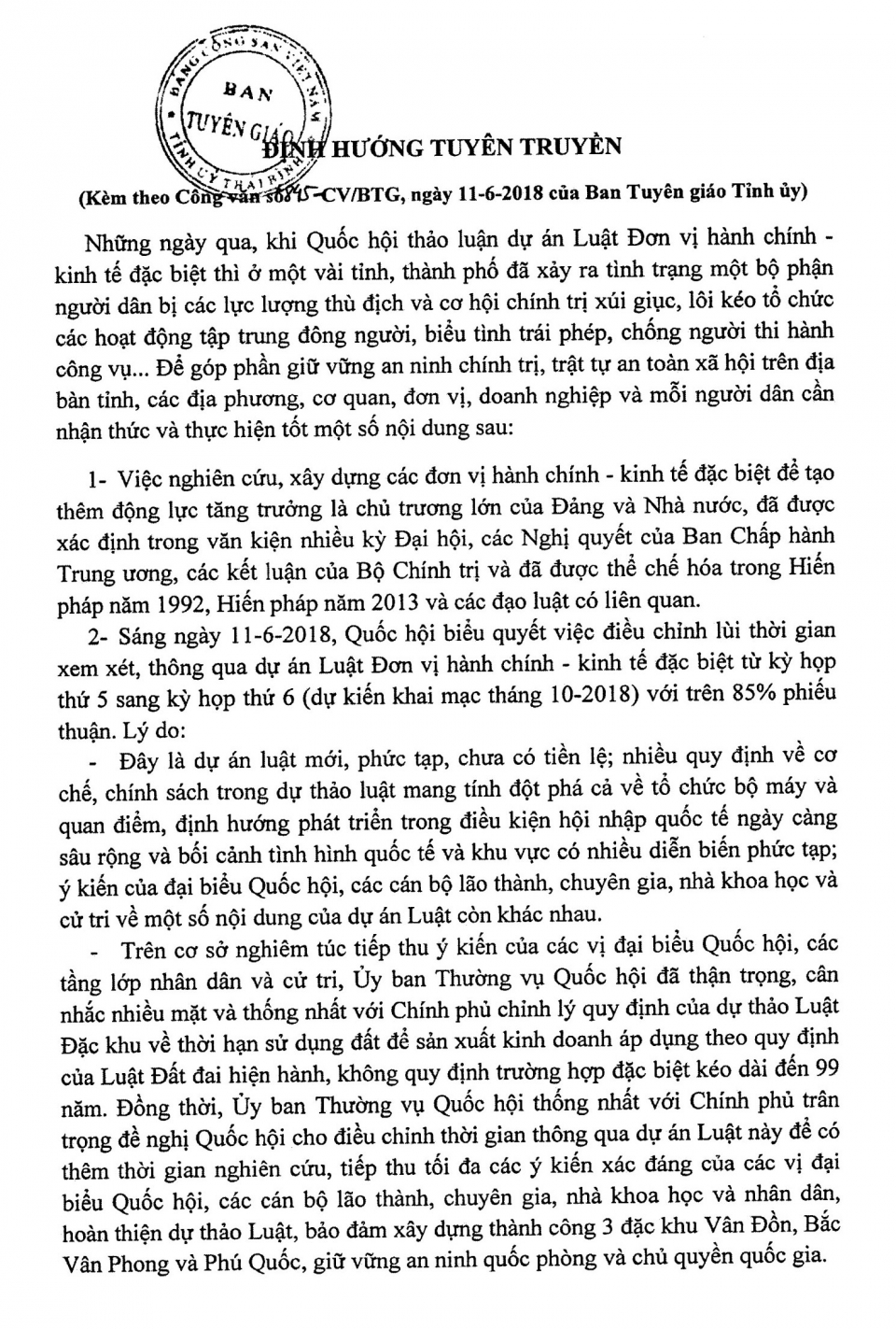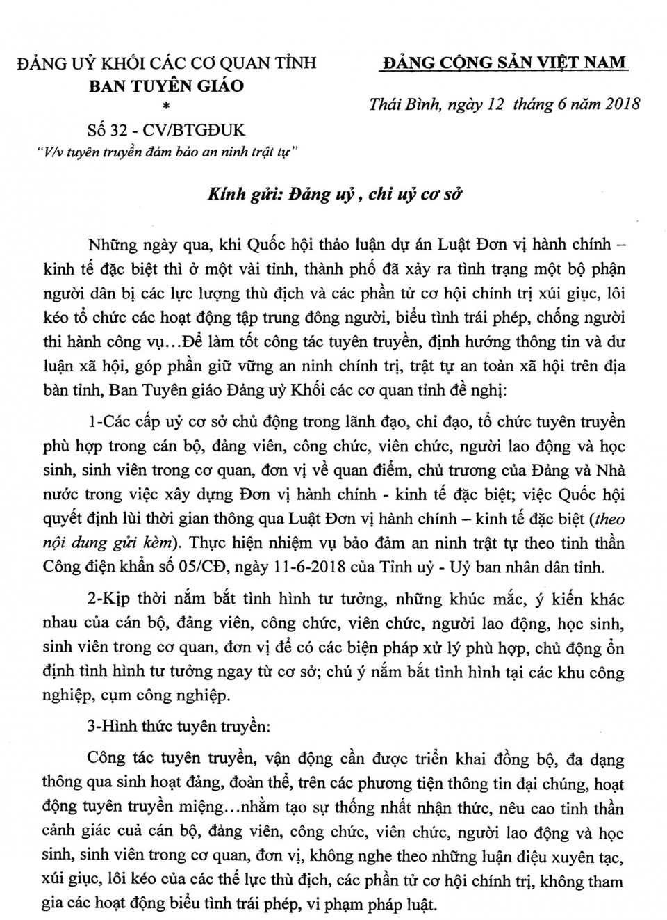 Ngày 12/6/2018, Ban Tuyên giáo Đảng ủy Khối các cơ quan tỉnh ra Công văn số 32-CV/BTGĐUK về việc tuyên truyền bảo đảm an ninh, trật tự.