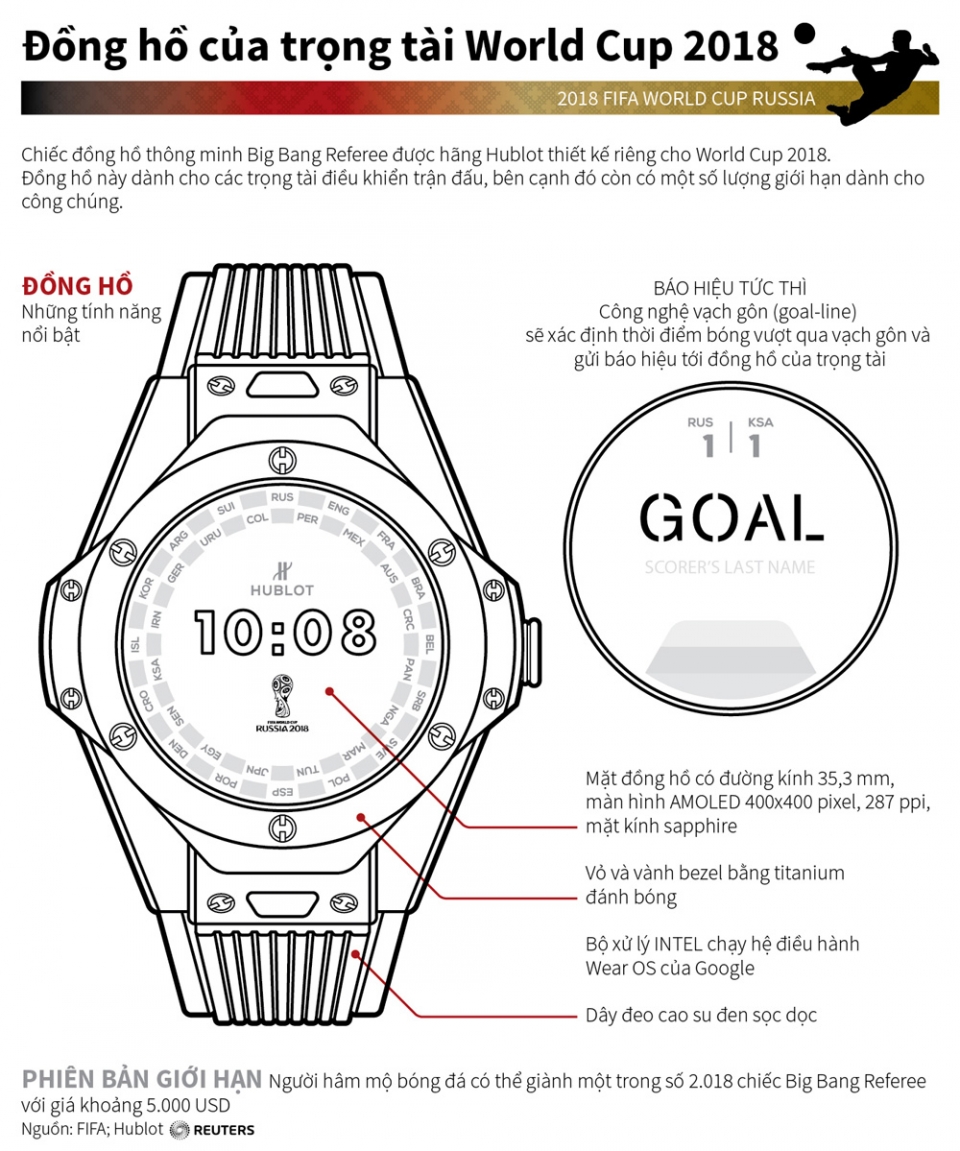 Chiếc đồng hồ thông minh Big Bang Referee được hãng Hublot thiết kế riêng cho World Cup 2018. Đồng hồ này dành cho các trọng tài điều khiển trận đấu, bên cạnh đó còn có một số lượng giới hạn dành cho công chúng.