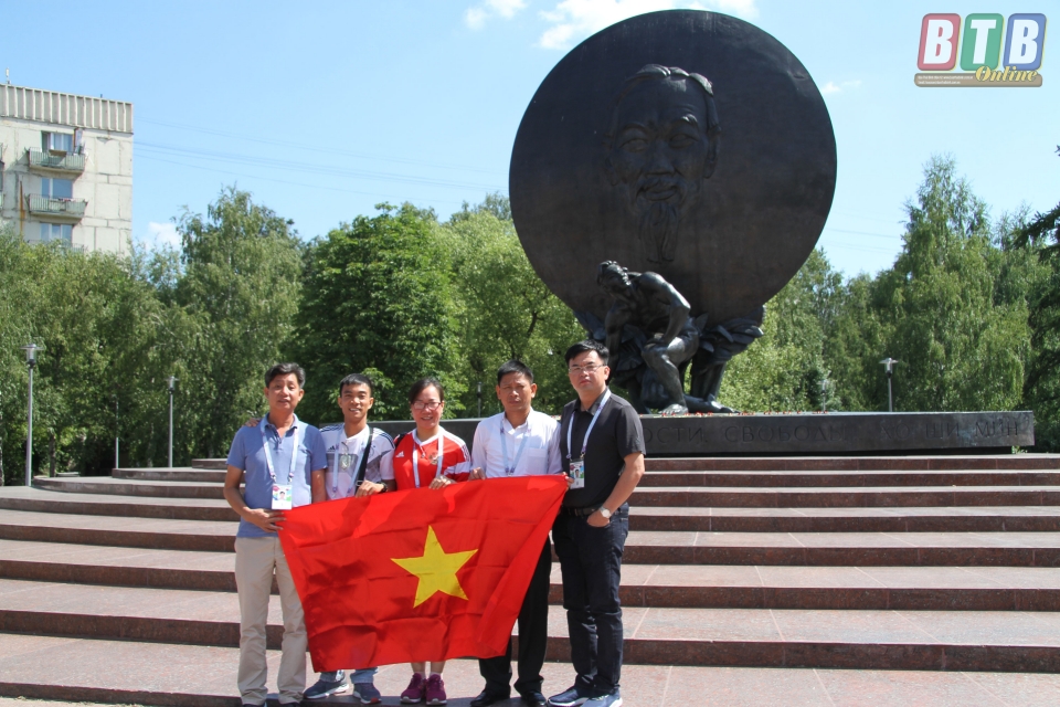 Một nhóm cổ động viên Việt Nam tại Quảng trường Hồ Chí Minh, thành phố Moscow, Liên bang Nga.