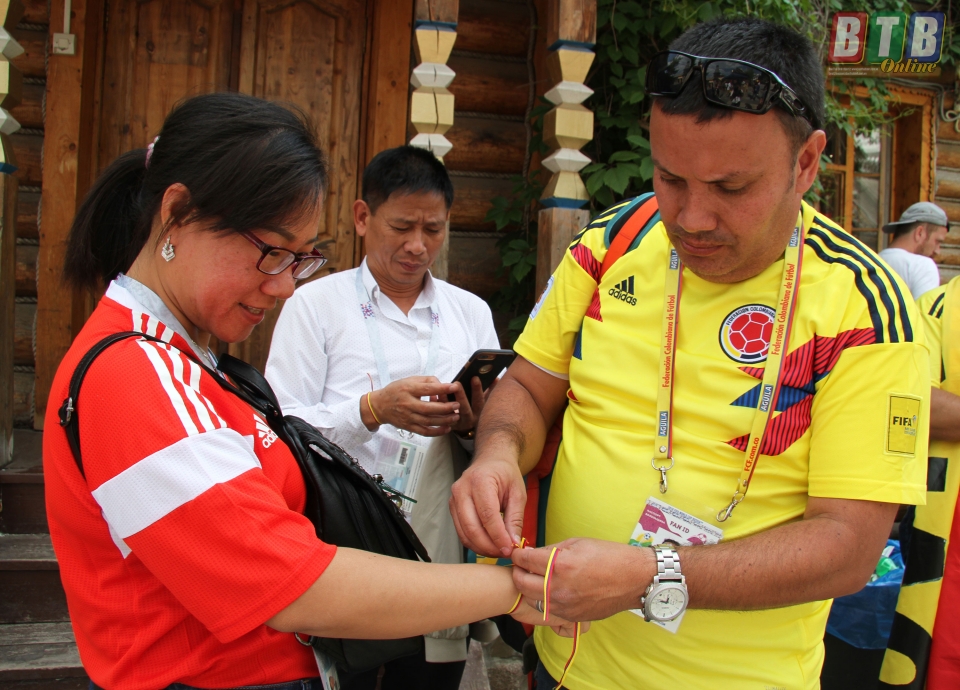 Cổ động viên Colombia tặng quà lưu niệm cho các cổ động viên đội bạn.