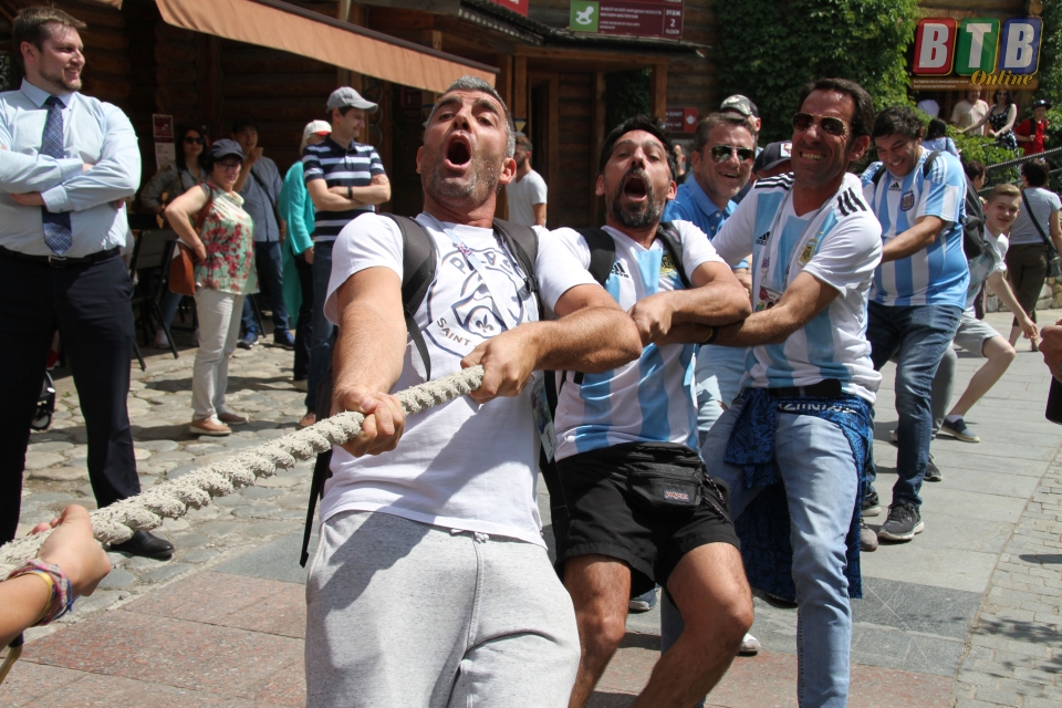 Cổ động viên người Argentina thi kéo co trong khu chợ lưu niệm Vernissage-Izmailovo.
