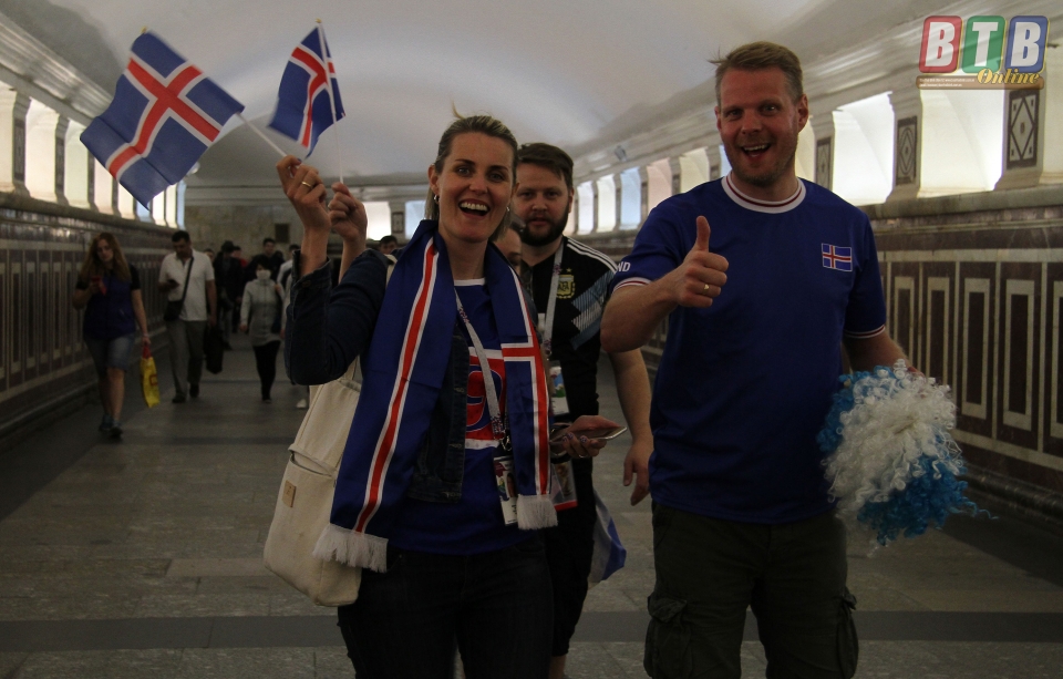 Cổ động viên Iceland ăn mừng trong nhà ga tàu điện ngầm khi đội nhà cầm hòa Argentina.