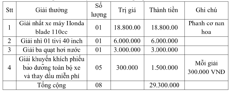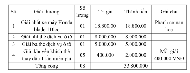 Cơ cấu giải thưởng đối với khách hàng mua hoặc sửa chữa Ôtô tại Đại lý: