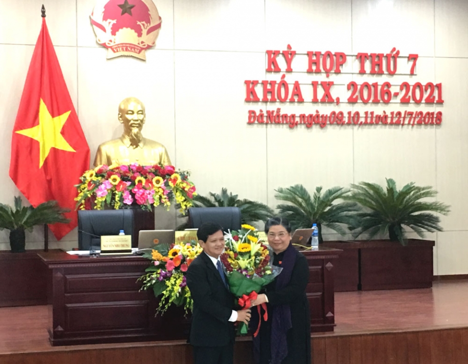 Đồng chí Tòng Thị Phóng tặng hoa chúc mừng tân Chủ tịch HĐND thành phố Đà Nẵng Nguyễn Nho Trung. (Ảnh: Anh Tuấn)