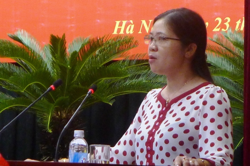 Phó Chủ tịch Hội Nông dân Nguyễn Thị Hồng Lý báo cáo két quả sau 5 năm thực hiện Nghị quyết 25-NQ/TW - ảnh: HM