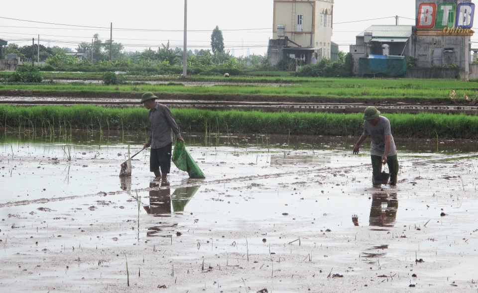 Ngoài Việt Hùng, xã Tân Hòa cũng đang khẩn trương triển khai các biện pháp chăm sóc lúa mùa sau mưa úng và tổ chức diệt chuột, ốc bươu vàng. Tính từ đầu vụ mùa đến nay, nông dân Tân Hòa đã diệt trừ được hơn 2.000 con ốc bươu vàng, gần 600 con chuột. Để ngăn ngừa sự sinh sôi, phát triển của ốc bươu vàng và chuột, xã cũng đã thành lập tổ diệt chuột, thí điểm ở 2 thôn Nhật Tân và Đại Hội gồm 14 thành viên trực thường xuyên để bảo vệ lúa.